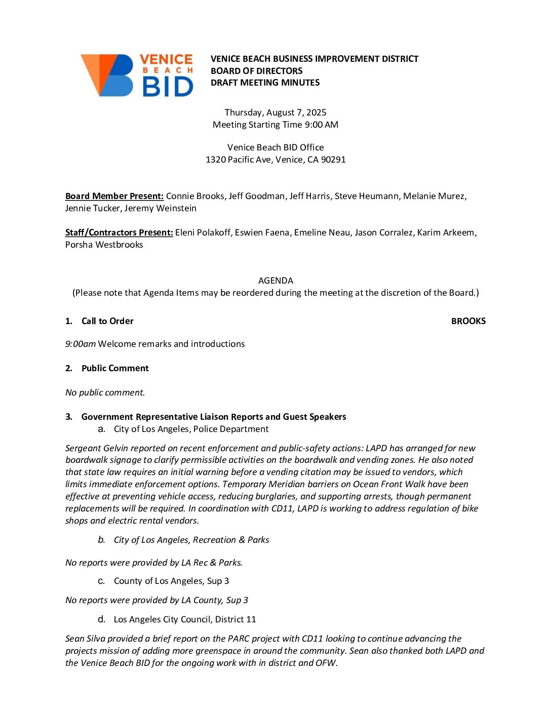 2025.08.07-Venice-Beach-BID-Board-of-Directors-Meeting-Minutes 2025.08.07-Venice-Beach-BID-Board-of-Directors-Meeting-Minutes December 13, 2025 Jeff Smith December 13, 2025